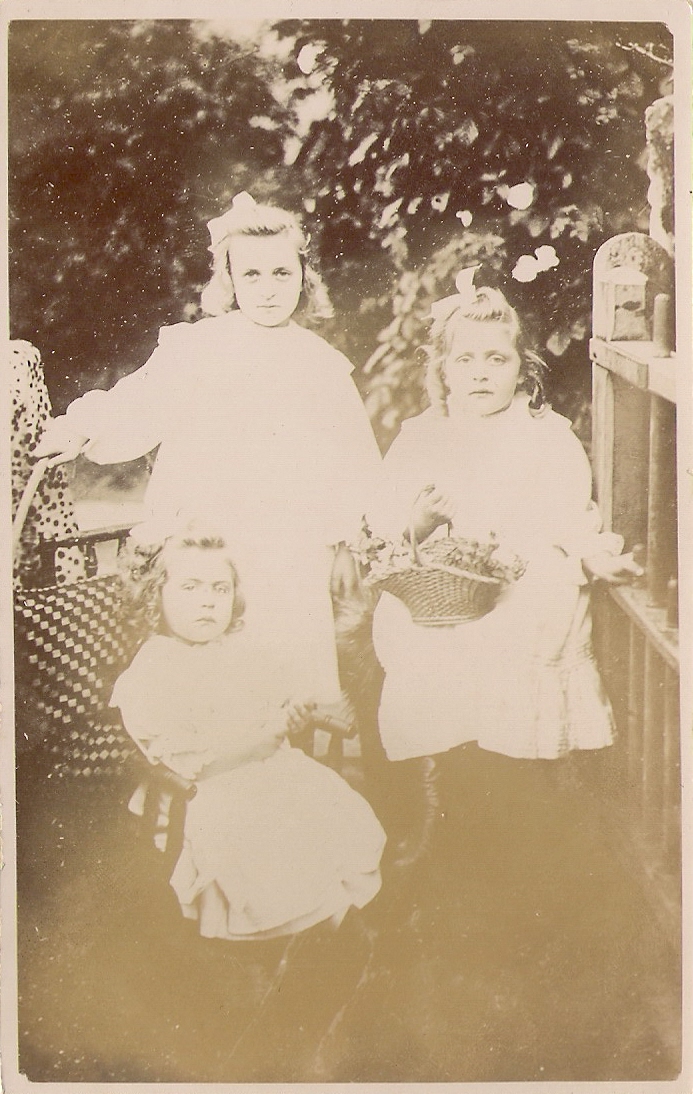 These three girls (probably sisters?) seem distinctly unhappy. Maybe they found it especially tedious to be interrupted in their play only to pose in prim white frocks holding ridiculous flower baskets. Again, a “divided back” photo-postcard; it looks much more recent than most of the other photos. Ironically, it is imprinted on a photo sheet of poorer quality and the portrait is, itself, not as well preserved. Just goes to show that other things were already beginning to preside over quality, I suppose?
