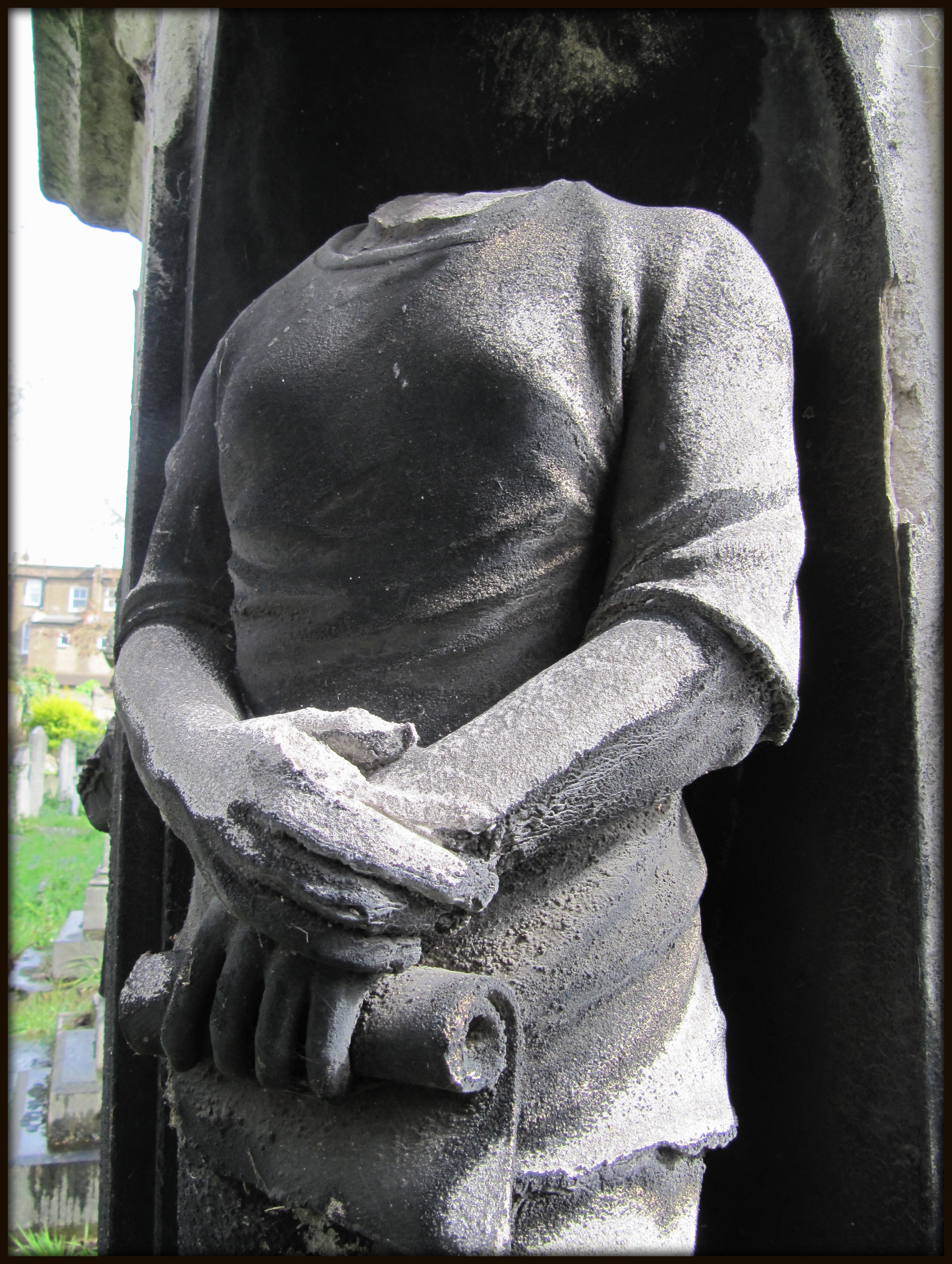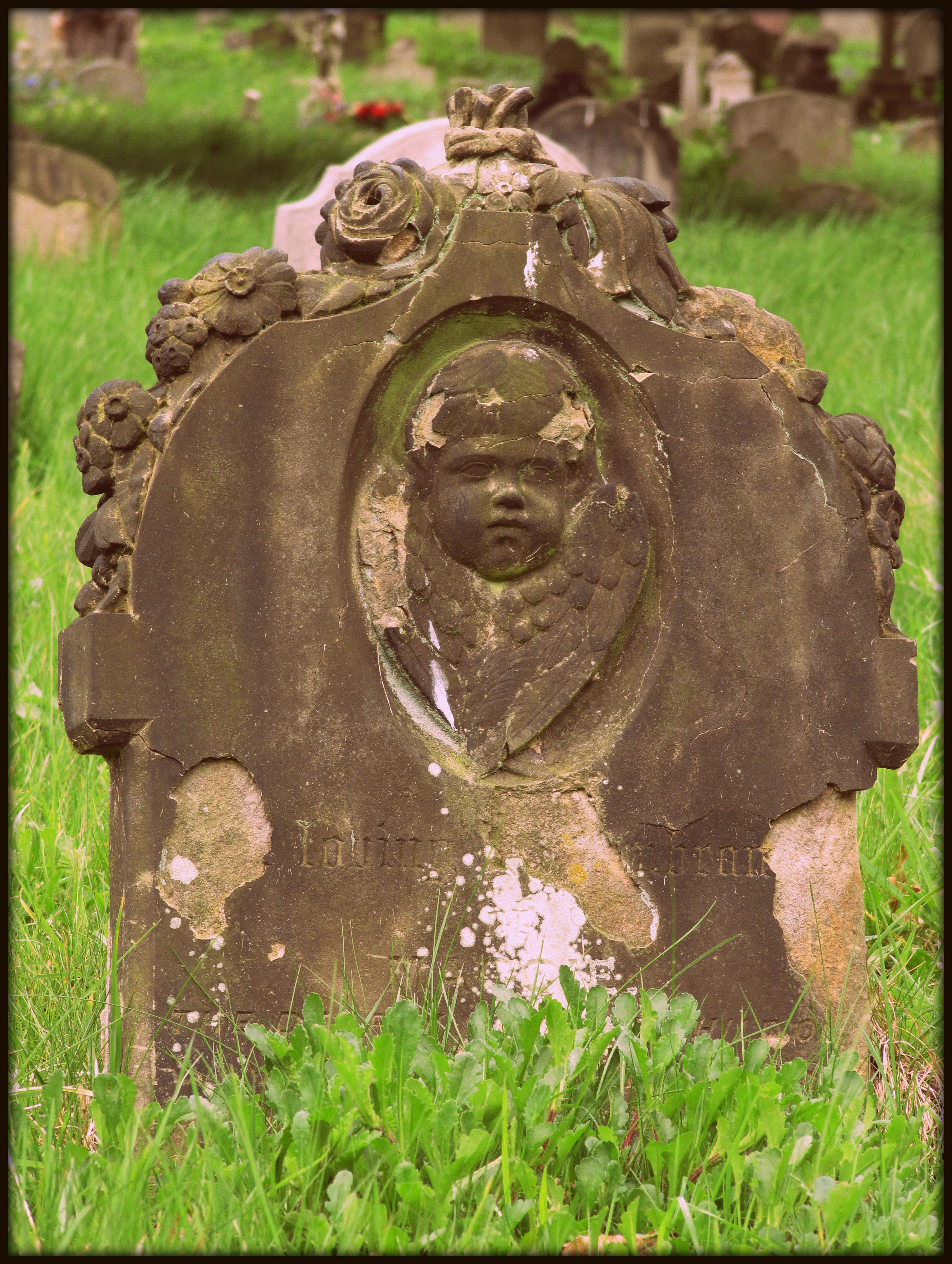 The first burials in the Brompton Cemetery took place in the late nineteenth-century, so I noticed plenty of beautiful effigies and epitaphs written precisely in accordance with the rules at the time. I wasn’t really allowed to roam about freely, as I might have wished; there were signs pointing out how some of the tombs and memorials were unstable, so it was best to keep to the safe footpaths, they said. (Of course, I didn’t entirely stick to their advice for safety, what taphophile would have? But I didn’t really feel like hugging the bones of some century old corpse, either.)