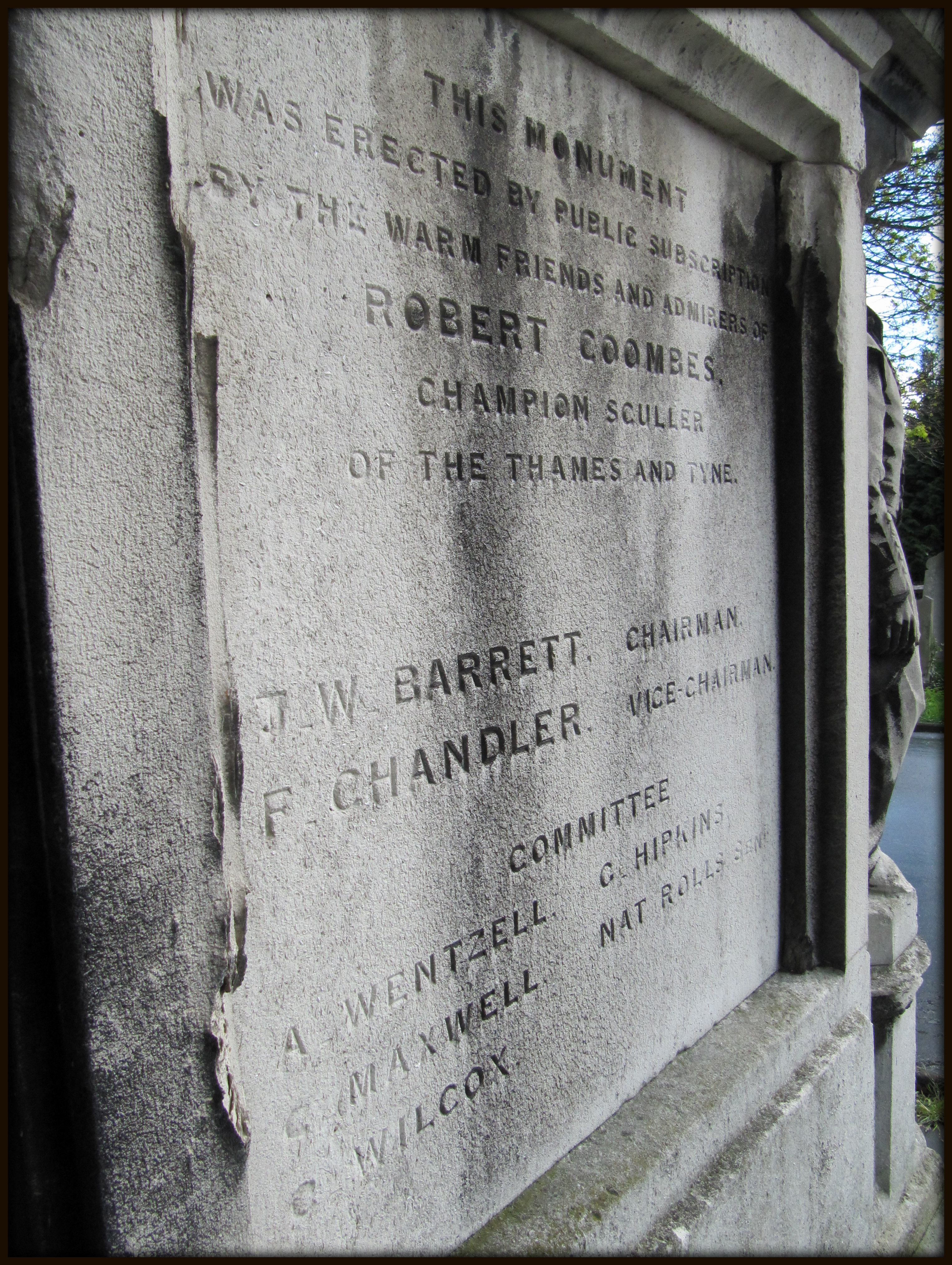 On one side of the cenotaph there was this inscription: This monument was erected by public subscription by the warm friends and admirers of Robert Coombes, champion sculler of the Thames and Tyne.// J.W. Barrett, chairman/ F. Chandler, vice-chairman// committee/ A. Wentzell, G. Hipkins, C.H. (?) Maxwell, Nat Rolls Sen, C.L. (?) Wilcox.
