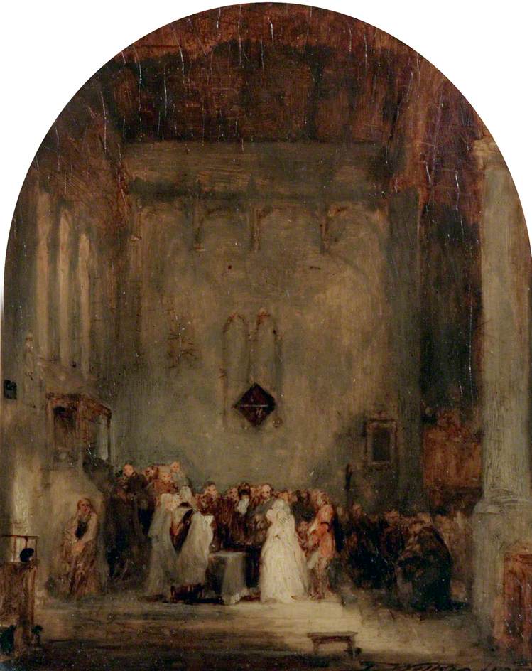 The Soldier’s Grave (1813) by Sir David Wilkie (1785-1841). “A church interior, with mourners. In the centre of the picture is a large group of figures standing around a coffin covered with a dark cloth”, quoth the BBC website. The painting is so small (19.7 x 16.5 cm), I had to squint, but still couldn’t make out much of what was happening. And yet, the dark colour palette, the barren, Romanesque church interior attracted me very much. I was compelled, I suppose, by how the imposing yet all the same claustrophobic environment reigned over the picture, which made the human figures seem rightly ghostly and amorphous.