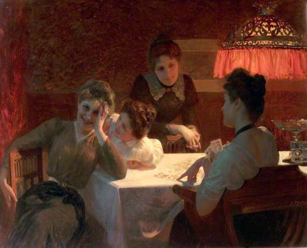 Love’s Oracle (ca. 1900) by Albert Ritzberger (1853-1915). I suppose the lighthearted atmosphere, the girlish dabbling with tarots and the soft reddish, intimate light triggered my nostalgia. It made me feel how good period movies make me feel: far away, comfortably numb and warm inside. I am mildly intrigued by the fact that the only face hidden from the viewer is that of the tarot reader herself. She is only the only one décolleté, which means that she is fashionable? well off? coquettish?