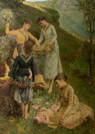 The Flowers of Capri (ca. 1887) by Filadelfo Simi (1849-1923). I am afraid to say this in not a painting I would normally have taken much notice of, since neither the style nor the subject do much for me. It was the gallery steward whom I mentioned earlier that pointed it out to me, and then dutifully transferred his own obsession into my brain. It’s difficult to see in the reproduction, but on the right hand side of the picture, just above the kneeling lady in yellow smiling at the baby, the patch of grass looks a bit wobbly and perhaps the space is slightly too… empty. That is because a seventh figure used to be there, whom the artist then painted over. No one has yet found out why he felt that was necessary, and it’s that mystery that keeps me interested.