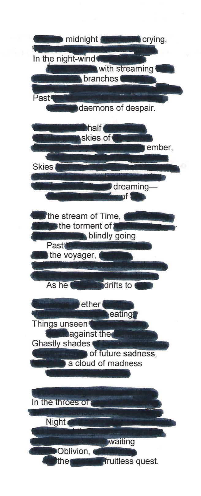 An ‘erasure’ poem. I thought this one would be easy-breezy, but it’s actually much more difficult than it seems. It took me many tries to come up with something half decent. And I’m still not entirely happy with it. I decided to work on a poem by horror fiction God H.P. Lovecraft, Despair. Lovecraft, for as much as he came to be regarded as one of the best (if not the best) writers of horror fiction, has always been a notoriously bad poet. Though, poor soul, he did try, again and again. So I thought I might give one of his poems a “post-modern face-lift”, so to speak. Here’s my lame attempt at it (I scanned the copy that I worked on, so as to preserve the initial format):