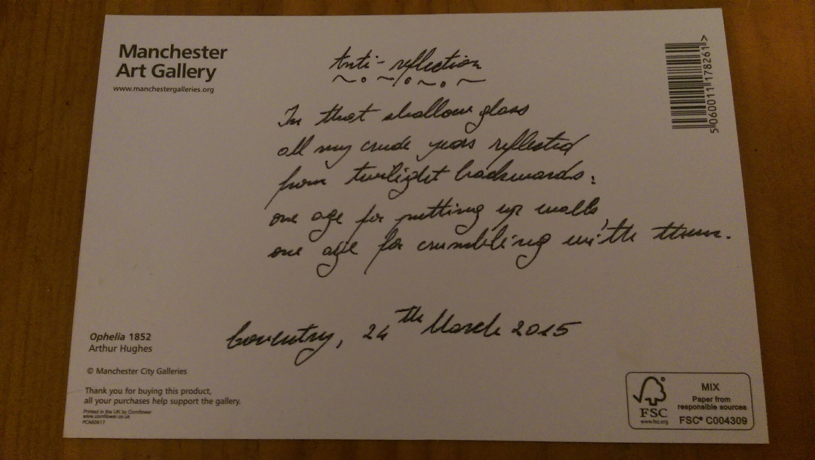 Posted on March 24, 2015March 26, 2015 by Encyclopaedia VanitatumAnother Rushed Postcard Anti-reflection In that shallow glass all my crude years reflected from twilight backwards: one age for putting up walls, one age for crumbling with them. Share this: Click to share on X (Opens in new window) X Click to share on Facebook (Opens in new window) Facebook Like Loading... Related