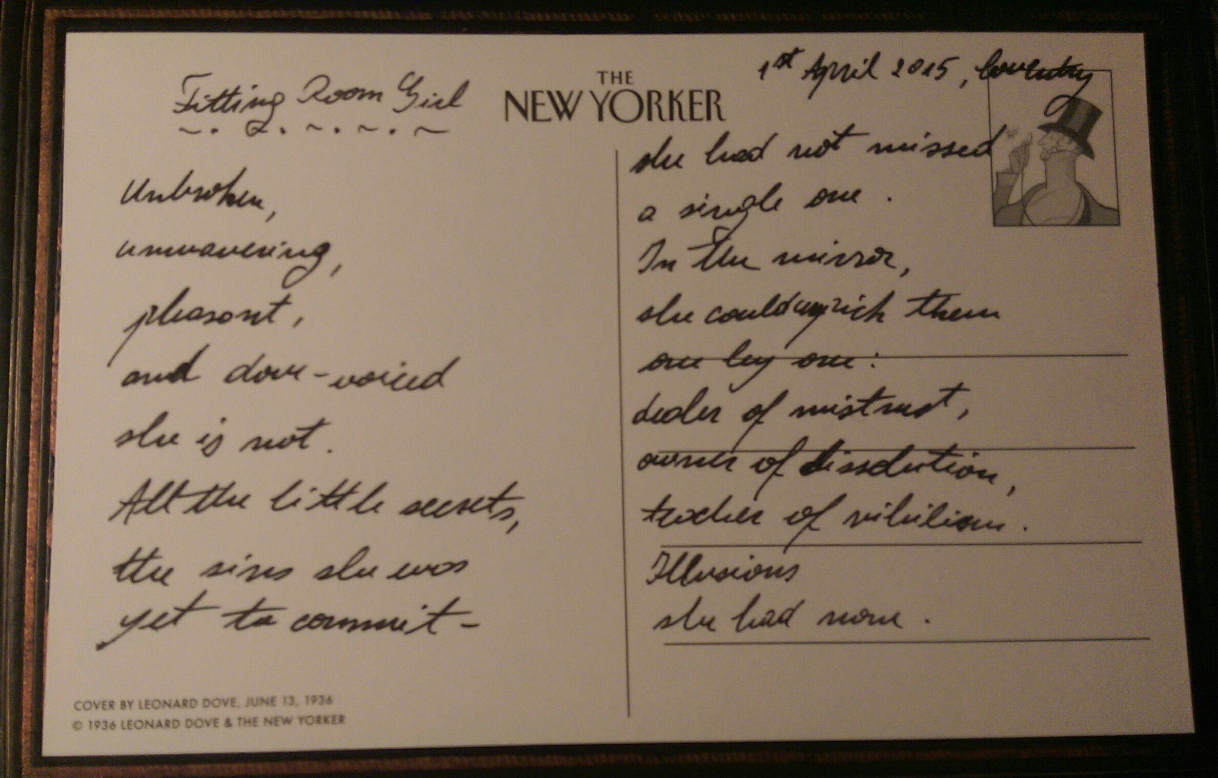 Out of seemingly nowhere, NaPoWriMo is upon me. So be it then. I’ll admit that after of month of daily lyricism I feel my creative juices starting to run dry. But I refuse to be daunted by that! I shall tame that inspiration! For the whole of April, therefore, I shall up my game. Not only will I go on with the project “Poem on a Postcard” for yet another month, but I will aim to stick to the daily NaPoWriMo prompts too (well, more or less)! Be afraid, world, be very afraid!