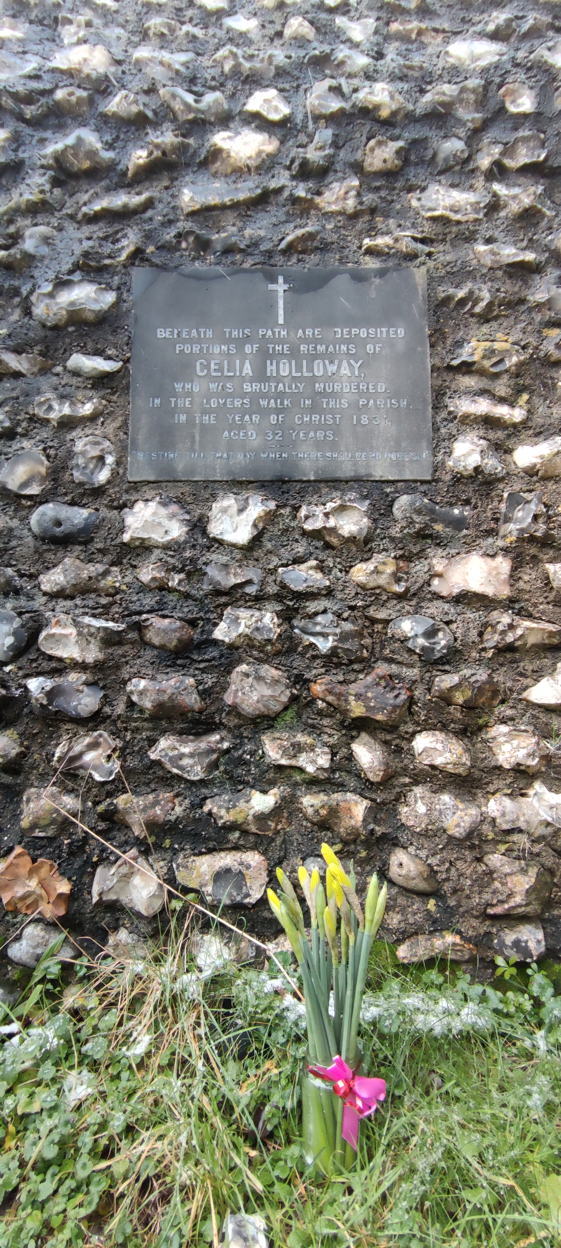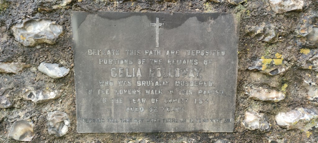 Beneath this path are deposited portions of the remains of Celia Holloway, who was brutally murdered. In the Lovers Walk in this parish. In the year of Christ 1831, aged 32 years. “Resting till that day when there shall be no more sin.”
